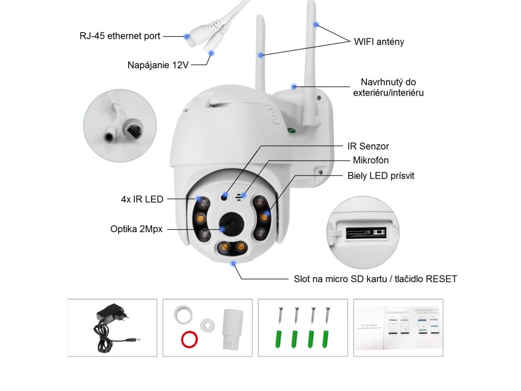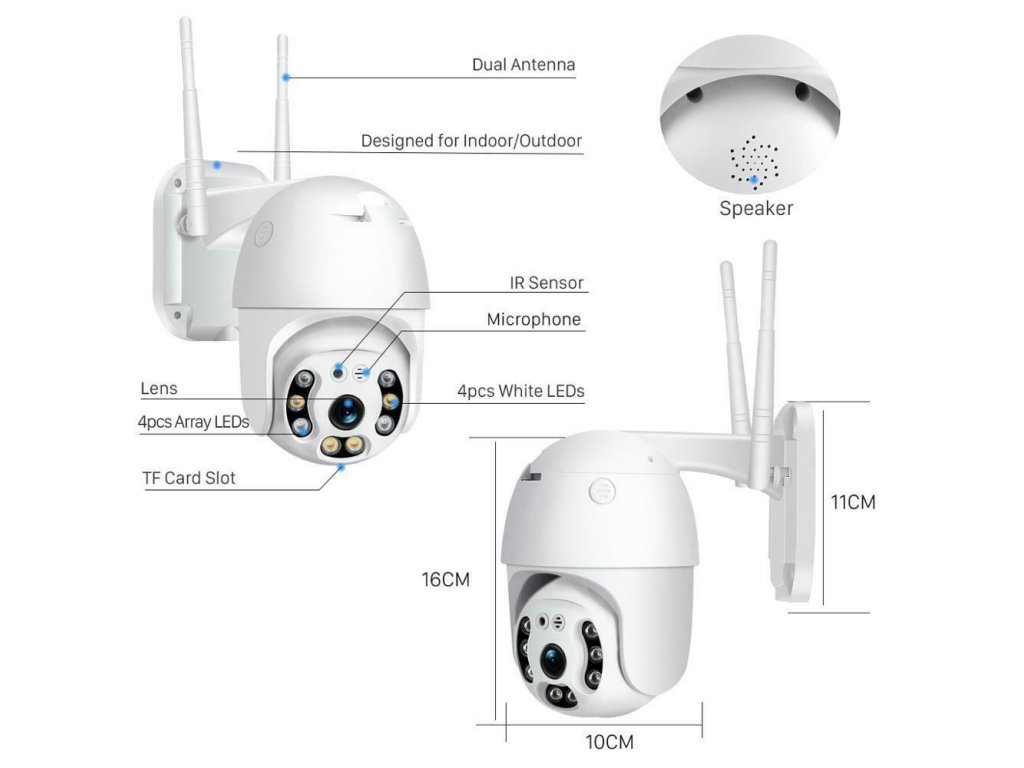 Kamera na von aj do vnútra. Jednoduché sledovanie cez mobilnú aplikáciu. Externá výkonná duálna anténa sa postará o spoľahlivý a stabilný bezdrôtový prenos prostredníctvom WiFi rozhrania. Kamera zaznamenáva obraz aj zvuk na micro sd kartu aj s podporou nočného videnia. Kameru je možné otáčať cez mobilnú aplikáciu, a sledovať celé okolie. Kamera je odolná proti vetru aj dažďu.
