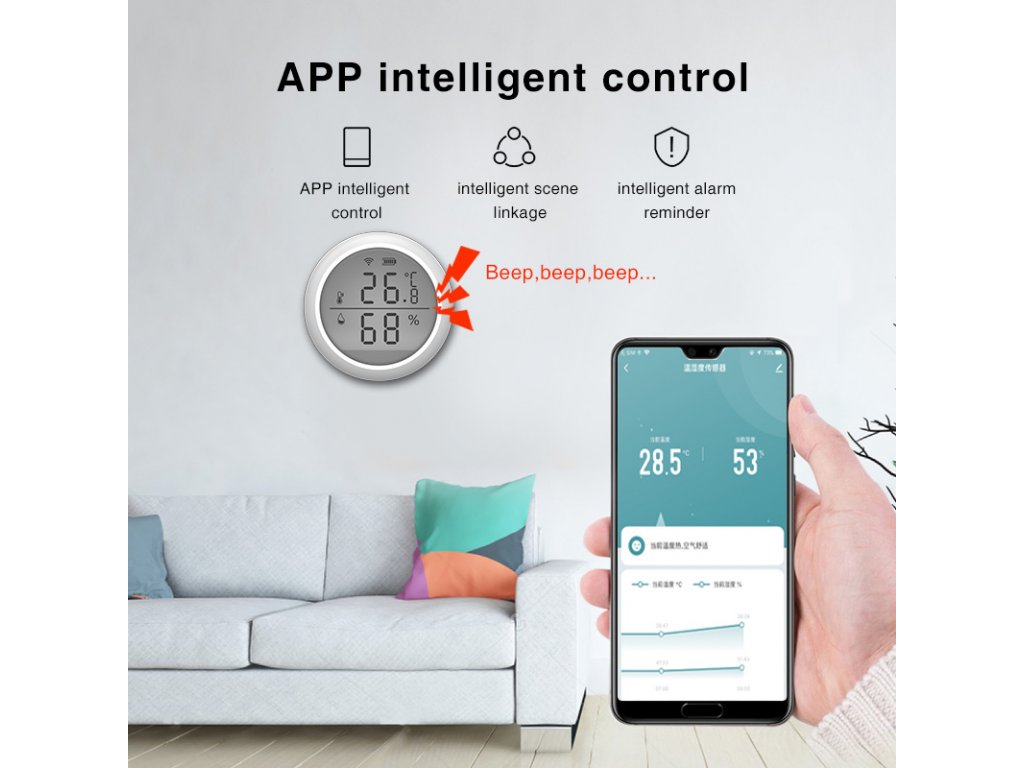 - Má vstavané senzory teploty a vlhkosti.